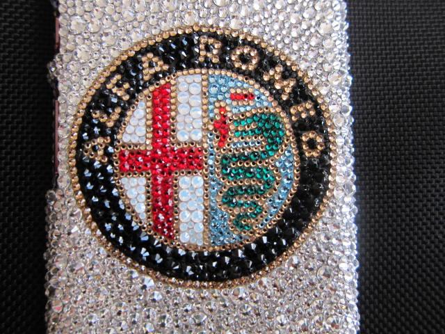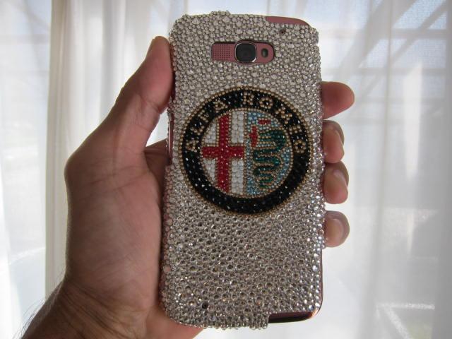 アルファロメオのスワロフスキー風特性スマホカバーをワンオフで作ってもらいました♪ギラギラピカピカで目立つのなんの。雷が落ちるのではないかと心配なくらいだぞ。次はどんなの作ってもらおっかな。