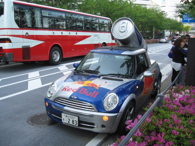 コスモワールド横に駐車中の珍しい車を発見。BMWミニのレッドブル宣伝カーです。抜群の注目度でこれなら使命を全うですね。この後、キャンギャル?が降りてきてレッドブルを配っておりました。※好みのタイプじゃなかったので写真は撮っておりません。