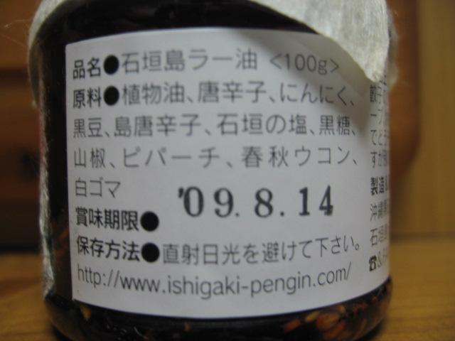 今年の夏に遊びに行った石垣島の有名なラー油です。あまりのおいしさに紹介するのをすっかり忘れておりました。このラー油は辺銀食堂(ペンギン食堂と読みます)という中華料理屋さんで販売している物で現地では「お一人様ひとつまで」と購入できる数に限りがある貴重品。私めは子供と一緒に入店し2個ゲット。利用方法は定番の餃子はもちろんのことラーメンやこれからが本番の鍋料理にもドバドバと投入しおいしさを満喫してます。お味は思ったより辛くなくなんと言っても香りがGOOD!原材料は写真の通り、唐辛子・にんにく・うこん・山椒等で変な添加物無し。お奨めです。