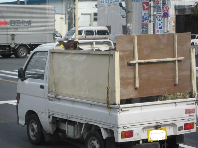 信号待ちをしている車列をふと見ると、軽トラックの荷台から悲しい視線でこちらを見ている生き物を発見。