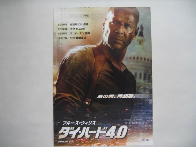 ダイハード4.0観たぞ!ブルース・ウイルスのオヤジパワー大爆発。凄くね?って冗談抜きに思います。派手なアクションシーンや強引な捜査方法がジョン・マクレーンの真骨頂ですが本当の年齢を感じさせない動きに脱帽。「おいおいそれはないだろ?」ってシーンもあったけどこの調子ならあと10年?はスクリーンを駆け回って楽しませてくれることでしょう。私めはこういうドッカンバリバリ系の映画が大好きなので次回作も期待です!そんなこんなでスッキリ気分を味わいたい方にはぜひ。