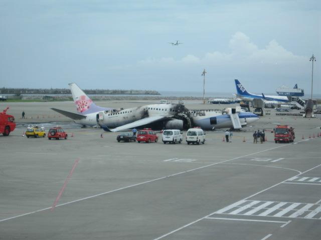 なんと帰宅日、しかも数時間前に例の中華航空機爆発炎上事故が発生してました。那覇空港に到着して現物を拝見しビックリ。「もうこりゃ廃車だな・・・」っと呟いたのは言うまでもありません。周りを良く見ると沢山の人たちがこの飛行機をバックに記念撮影をしてるし「日本って平和だなぁ・・」と思わせる事件でした。